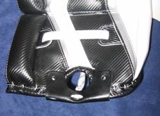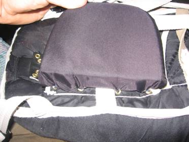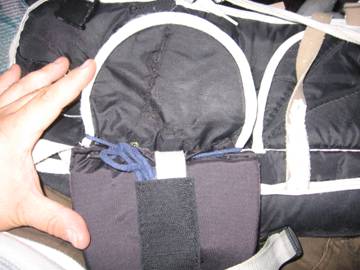 At the bottom of the figure 1, a makeshift knee-wing is shown. The flap is perforated with three or four 1/8” eyelets at the base of the flap just outside the stiching that attaches to the body of the goal pad. Eyelets can be found at Michael’s and are installed with a hammer and wood block.