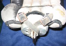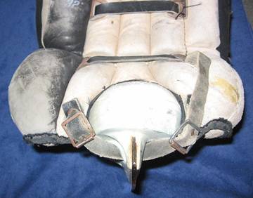 Figure 1 is an example of a single aftermarket knee wing affixed to the inside knee area of an Itech profile 24” goalie pad. This pad was likely purchased cca 2001 and is typical of that available for rent in many local minor hockey associations.[2] The original knee “protection” flap is shown. It provides almost no cushion to the knee, and is insufficient to learn profly goaltending.